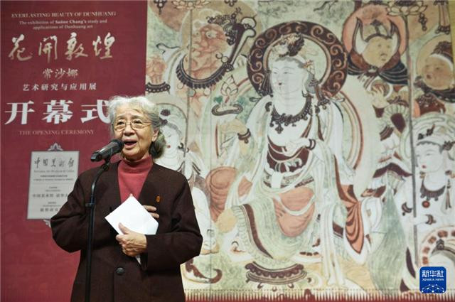 常沙娜在“花开敦煌——常沙娜艺术研究与应用展”开幕式上致辞。新华社记者鲁鹏摄