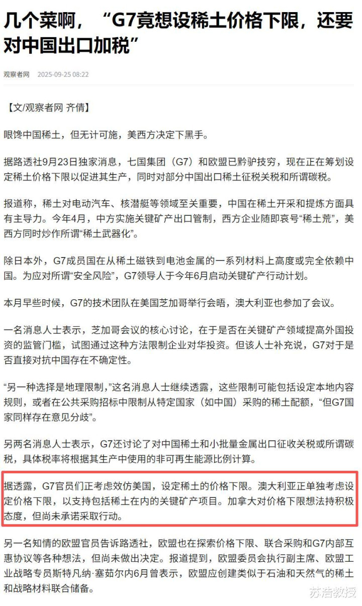 其实七国集团内部并不是铁板一块,对稀土出口采取措施,主要是美国出的主意,其他国家虽然附和,但是并不愿意真金白银的采取行动。