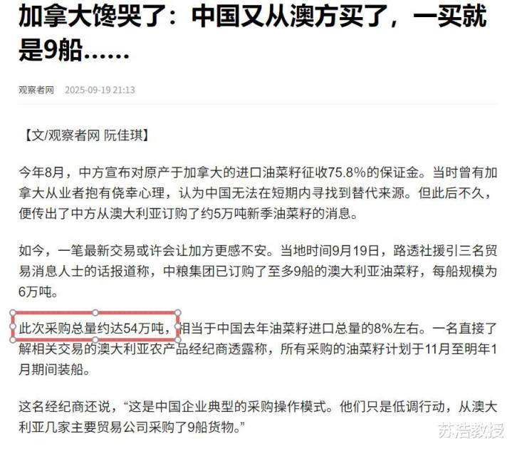 要知道就在这个月,中国才刚刚从澳大利亚下单了,至少9艘船的油菜籽,总量大概有54万吨。