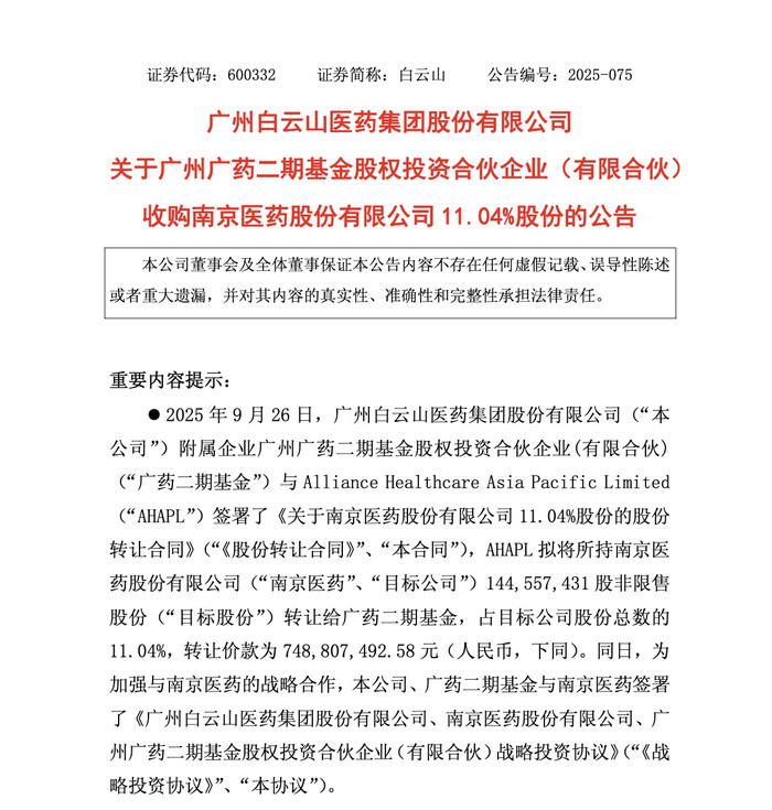 在主营业务持续下滑、现金流告急的危机时刻,白云山(600332.SH,00874.HK)却选择了一场7.49亿元的收购生意。9月26日,这家老牌医药巨头宣布收购南京医药(600713.SH)11.04%股权,一举跃升为后者第二大股东。