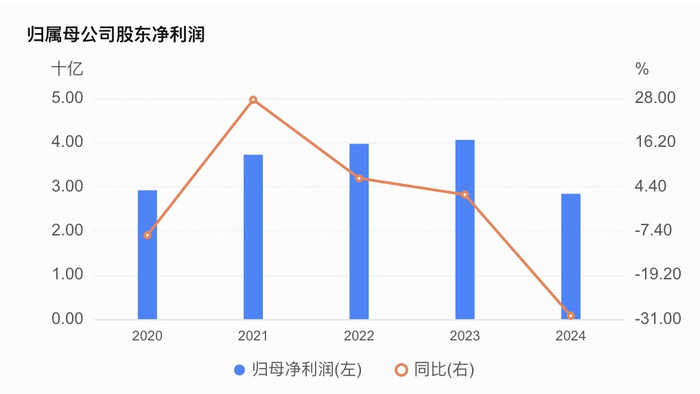实则拉长时间线来看,白云山的业绩颓势已经持续了相当长的时间,但2024年的数据显示,全年营业收入749.93亿元,同比微降0.69%;归属股东净利润28.35亿元,同比暴跌30.09%,创下近七年来最低水平。